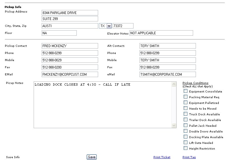 Additional fields such as pickup instructions, pickup notes, requirements and restrictions are also available so that detailed pickup tickets can be generated from this information. Pickup tickets can printed with all information necessary for the trucker to efficiently locate and retrieve goods.