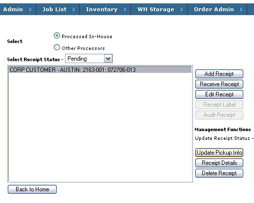 Pickup information (address, contact info, etc) is also pulled from the Customer / Location record associated with the Receipt as defined in the Job Admin module.